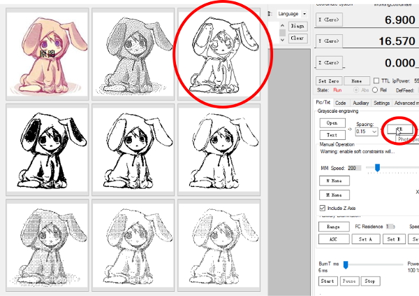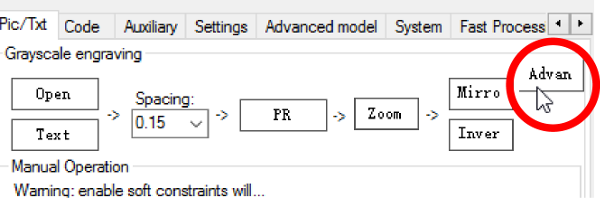 В этой статье мы расскажем, как резать 5.6Вт лазером, установленным на DIY платформу, короткой линзой G2 с помощью программы CNCC V2.50. Для резки мы будем использовать режим Advan. Нажимаем на него (его расположение показано красным кружком).