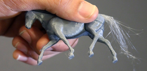 Для создания каждого волоска печатная головка принтера сначала размещает каплю расплавленного пластика на основе (в данном случае, на голове кукольного тролля), которая располагается на печатной поверхности. Затем сопло и печатная поверхность резко отдаляются друг от друга по горизонтали – так что пластик растягивается. Этот процесс повторяется несколько раз, и 3D-принтер размещает каждую следующую каплю материала в соответствии с заданной моделью.