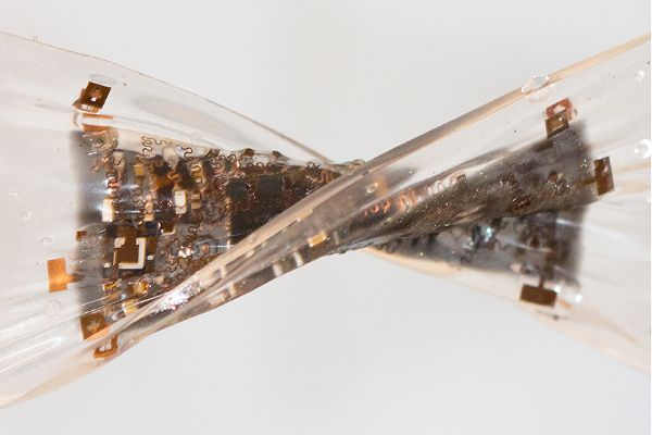 Ученые расположили слои эластомерной пленки и электронные элементы один на другом, изготовив «умный пластырь» размером с монету. По словам разработчиков, гибкая электроника позволяет создавать устройства, которые приспосабливаются к динамичным поверхностям, таким как тело человека.