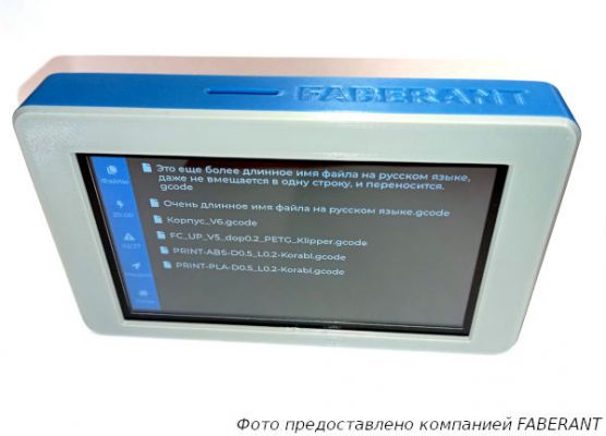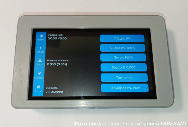 В дисплее используется 4.3-дюймовая IPS матрица с разрешением 800х600 точек и аккумулятор емкостью 1200 мАч. В основе решения – прошивка CYD-Klipper, русифицированная и улучшенная для принтеров Faberant.