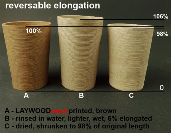 Материал легко изменяется после печати, поскольку третьим свойством LAYWOODmeta5 является его зависимость от внешних условий. Необычная особенность означает, что филамент вытягивается при контакте с водой и слегка сжимается при высушивании. Такие эффекты полностью обратимы, поэтому печатные предметы могут быть возвращены в исходную форму после воздействия.