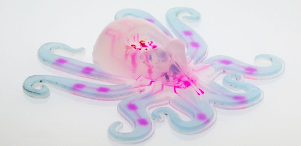 В Octobot устранены все эти недостатки. Робот, разработанный в Гарварде группой ученых под руководством Роберта Вуда и Дженнифера Льюиса, вообще не имеет внутреннего скелета, подобно настоящему осьминогу, и движется с помощью пневматической системы: внутри мягкого каркаса расположен ряд трубок и камер и перекись водорода в качестве активного химического компонента. При взаимодействии перекиси с платиновым катализатором образуется водяной пар и кислород, и эта смесь, расширяясь, заставляет двигаться щупальца Octobot.