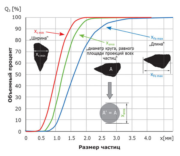 Рис. 1. Некоторые параметры формы частиц, определяемые методом динамического анализа изображений. Вычисляется распределение частиц по ширине (красная кривая), длине (синяя кривая) или эквивалентному диаметру проекции (зеленая кривая).